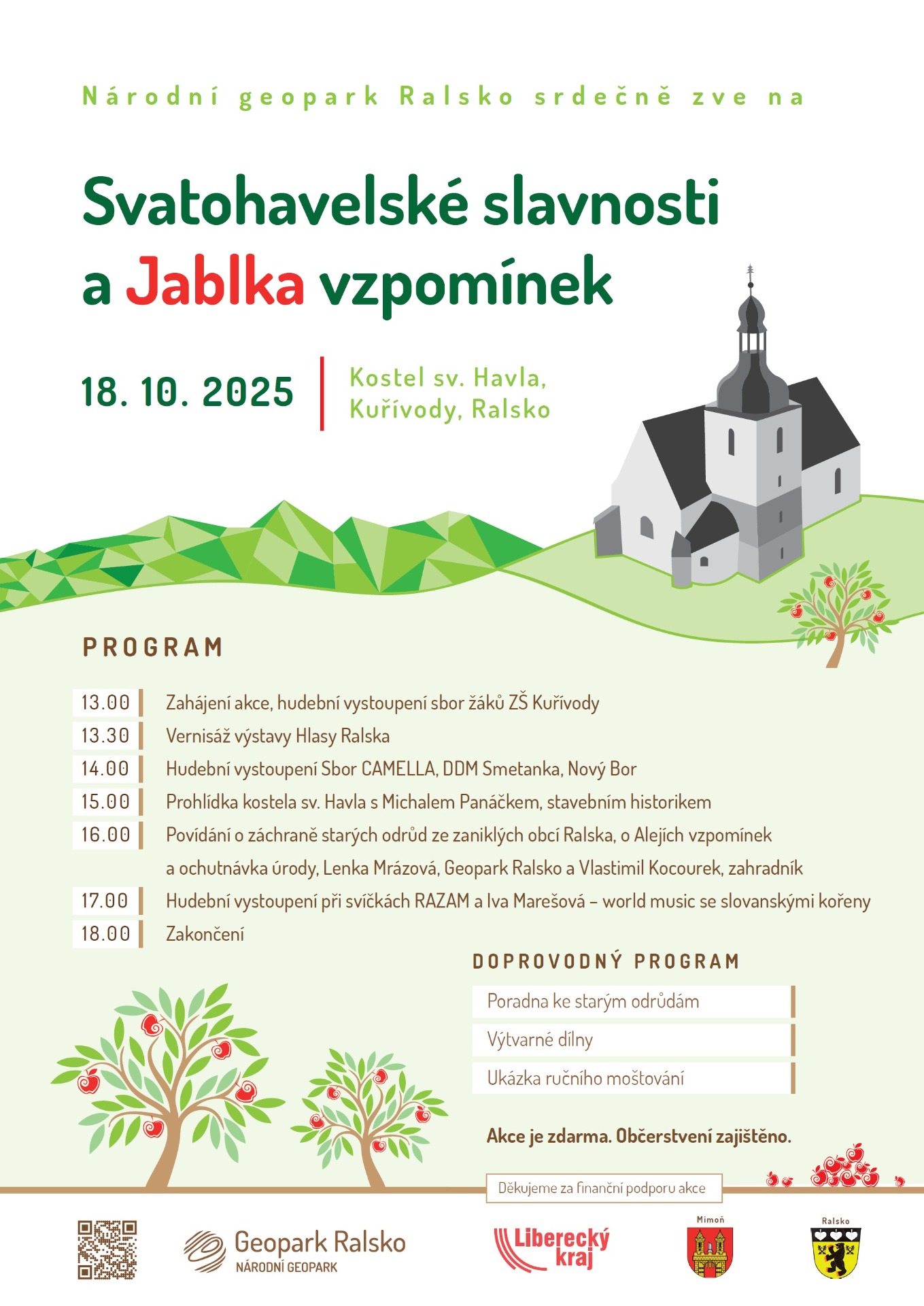 Hudební vystoupení • Vernisáž výstavy • Prohlídka kostela • Povídání o starých odrůdách a ochutnávka úrody • Koncert při svíčkách