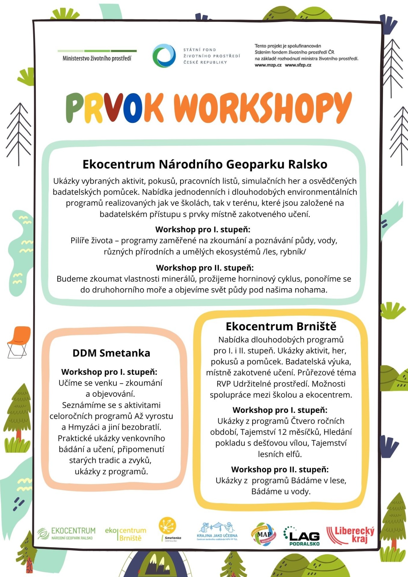 Představení pestré nabídky programů s enviromentální tématikou, praktická ukázka pomůcek a her, možnost vyzkoušet si badatelské aktivity používané v programech, sdílení příkladů dobré praxe, inspirace pro zpestření hodin prvouky, přírodopisu a zeměpisu.